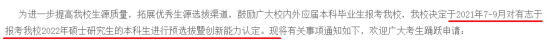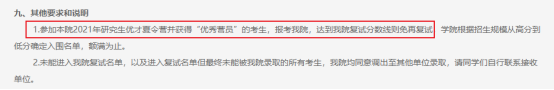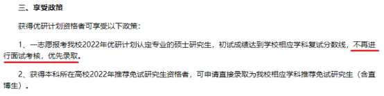 2021年该校硕士“萃英计划”工作的通知中提到,被接收的“萃英计划生”可享受“一志愿报考我校,满足学校和学院的录取政策下,初试成绩达到复试分数线即可录取,不再参加复试”。
