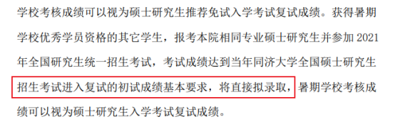 建筑与城市规划学院2021年复试安排中提出,获得暑期优秀学员资格的其他考生,报考本院相同专业的研究生并参加统考,初试成绩达到同济大学的要求,即可直接拟录取。