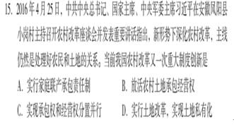 | 真题第8题 随着工业化、城镇化的深入推进,大量农民转向非农业,我国农村土地流转现象日益普遍。农业经营方式发生深刻变化,截至2016年6月,全国家庭承包经营耕地流转已超过30%,流转土地4.6亿亩。当前,为解决拥有土地承包经营权的人不再种地、种地的人又没有相应权利这一突出问题,我国在深化农村改革方面做出的重大制度创新是 A.实行农村集体经营性建设用地入市 B.实行农村家庭联产承包责任制 C.实行农村土地所有权、承包权、经营权分置 D.实行农村耕地保护制度 |
