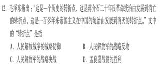| 真题第12题 1947年6月底,根据中共中央的决策和部署,刘伯承、邓小平率领的晋冀鲁豫野战军主力,实施中央突破,千里跃进大别山;陈毅、粟裕指挥的华东野战军主力为东路,挺进苏鲁豫皖地区;陈康、谢富治指挥的晋冀鲁豫野战军一部为西路,挺进豫西,三路大军相互策应,机动歼敌,迫使国民党军处于被动地位,这表明 A.人民解放军在数量上已经超过国民党军队 B.人民解放战争战略进攻的序幕由此揭开 C.人民解放军同国民党军队进行战略决战的时机已经成熟 D.人民解放战争进入战略相持阶段 |