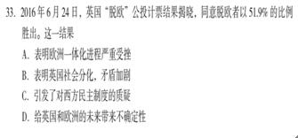 | 真题第33题 33.2016年6月23日英国举行脱离欧盟全民公投.脱欧阵营以51.9%对留欧阵营48.1% 的微弱得票优势胜出,英国成为首个投票脱离欧盟的国家,为欧洲一体化进程带来变数,导致英国“脱欧”的因素主要