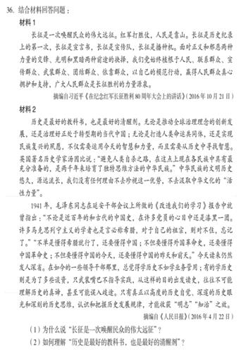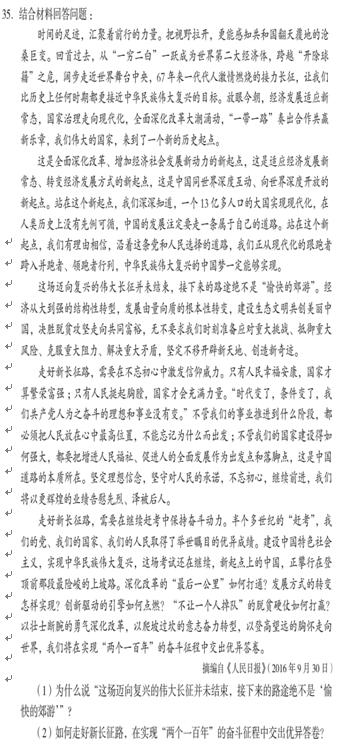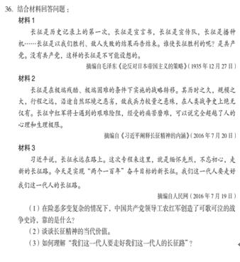 长征的胜利,不仅保存了革命力量,而且使我们党找到了中国革命力量生存发展的落脚点,打到了中国革命事业胜利前进新的出发点,从长征的终点出发,我们党领导中国人民展开了中国革命波澜壮阔的新画卷。 历史是不断向前的、要达到理想的彼岸,就要沿着我们确定的道路不断前进,每一代人有每一代人的长征路,每一代人都要走好自己的长征路。今天,我们这一代人的长征,就是要实现“两个一百年”奋斗目标,实现中华民族伟大复兴的中国梦。 实现伟大的理想,没有平坦的大道可走,夺取坚持和发展中国特色社会主义伟大事业新发展,夺取推进党的建设新的伟大工程新成效,夺取具有许多新历史特点的伟大斗争新胜利,我们还有许多“雪山”、“草地”需要跨越,还有许多“娄山关”、“晴子口”需要征服,一切贫图安逸、不愿继续艰苦奋斗的想法都是要不得的,一切骄傲自满、不愿继续开拓前进的想法都是要不得的。 长征永远在路上。一个不记得 来路的民族,是没有出路的民族。不论我们的事业发展到哪一步,不论我们取得了多大成就,我们都要大力弘扬伟大长征精神,在新的长征路上继续奋勇前进。 摘自习近平《在纪念红军长征胜利80周年大会上的讲话》 (1)为什么说长征的胜利既是“中国革命力量生存发展新的落脚点”,也是“中国革命事业胜利前进新的出发点”?(6分) (2)如何理解“长征永远在路上”?(4分) |