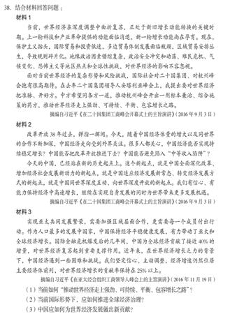 | 真题第38题 38.结合材料回答问题: 领导人峰会在这里隆重举行,中国国家主席习近平主持会议并发表重要讲话 是构建创新,活力,联动,包容的世界经济,作为今年中国最重要的主场外交,也是近年来中国主办的级别最高、规模最大、影响最深远的国际峰会,除了G20成员,还有8个嘉宾国领导人以及7个国际组织负责人与会。人们希望中国智慧能为长期疲软的世界经济准确把脉,找到病根,开出标本兼活、综合决策的良方。 中国一直是G20积极的参与者,建设者。贡献者,今年肩负起G20峰会,主席国的重任。跃变为全方位的协调者和强有力的主导者。本届峰会尚未开幕。习近平主席就和奥巴马总统先后向联合国秘书长潘基文交存了中国和美国关于气候变化的《巴黎协定》批准文书。不仅提前向峰会递上一份大礼,也为会议定下了以建设性伙伴关系处理各项议题的基调。 在中国的精心组织和与会各方的共同努力下,杭州峰会取得了丰硕成果,发表了《二十国集团领导人杭州峰会公报》,就推动世界经济增长,达成许多重要共识、聚焦创新、结构性改革、新工业革命、数字经济等新方式,制定并通过了《二十国集团创新增长蓝图》、《二十国集团深化结构性改革议程》、《2016年二十国集团创新行动计划》、《二十国集团新工业革命行动计划》,《二十国新集团落实2013年可持续发展议程行动计划》等28份成果文件,明确了世界经济的前进方向和具体行动计划,以期为世界经济开辟新道路、拓展新疆界。第一次把发展问题置于全球宏观政策框架突出位置,第一次就落实联合国2013年可持续发展议程制定行动计划,第一次集体支持非洲和最不发达国家工业化。在二十国集团历史上具有重要开创性意义;强调二十国集团成员虽然国情不同,发展阶段不同,面临的现实挑战不同,但推动经济增长的愿望相同,应对危机挑战的利益相同,各方应该“彼此包容、守望相助”,“坚定前行,共抵彼岸”。习近平主席特地用“桥”来比喻二十国集团,称其为“友谊之桥、合作之桥”,和“未来之桥”。 中国在本次峰会上发挥的巨大作用,得到与会国家和国际组织领导人的高度认可。联合国秘书长潘基文高度赞赏杭州峰会,称中国作为G20轮值主席国,作出了杰出贡献;尤其是推动峰会在“说易行难”的可持续发展议题上制定行动计划,更是历史性的贡献,向世界展现出卓越领导力。 ——摘编自《人民日报》(2016年9月4日、9月5日、9月6日) (1)结合当前国际环境,分析二十国集团领导人杭州峰会主题的现实意义。(6分) (2)习近平主席用“桥”比喻二十国集团,体现出中国怎样的外交理念与世界情怀?(4分) |