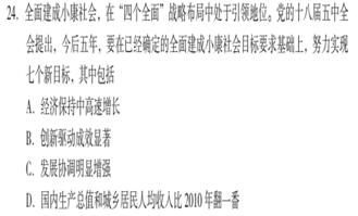 | 真题第25题 党的十八届五中全会提出“创新、协调、绿色、开放、共享”的新发展理念,把创新作为引领发展的第一动力。在这一新发展理念的指导下,2016年5月党中央和国务院颁布了《国家创新驱动发展战略纲要》,把创新作为引领发展的第一动力是 A.提高核心竞争力的必然选择 B.构建和谐世界的内在要求 C.引领经济发展新常态的根本之策 D.分析世界发展历程和总结我国改革开放实践得出的结论 |