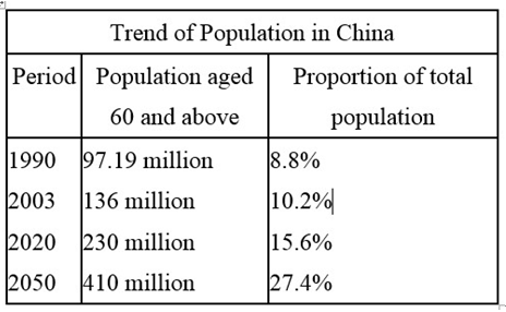 As for the issue of aging, its situation has been growing increasingly severe in spite of the fact most people are still ignorant of the problems it brings about. Firstly, with families becoming smaller and living pace escalating, it is even graver for families to care for aged members adequately. Secondly, aging causes a relative decline in working force in that fewer people have to support the increasing aged people. Consequently, the productivity of the whole society is affected to some extent. Thirdly and most importantly, the aging of population in China resulted from the successful implementation of family planning has not been synchronized with national economic progress.