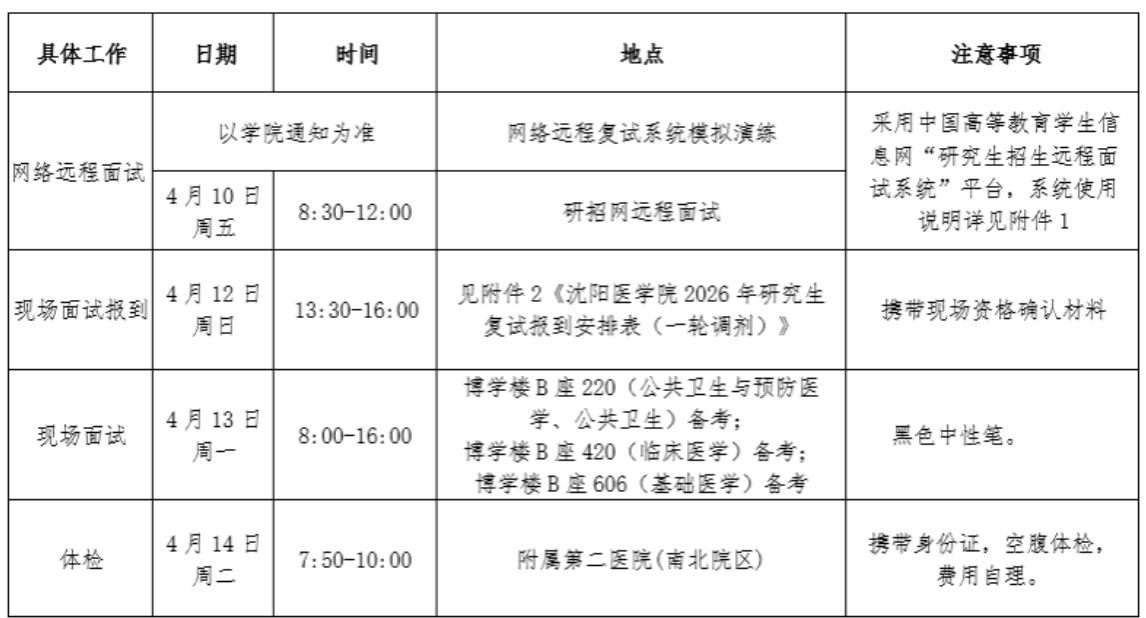 具体要求参考沈阳医学院2026年硕士研究生调剂公告(https://yjsjy.symc.edu.cn/info/3832/14172.htm),复试日程安排见下表。