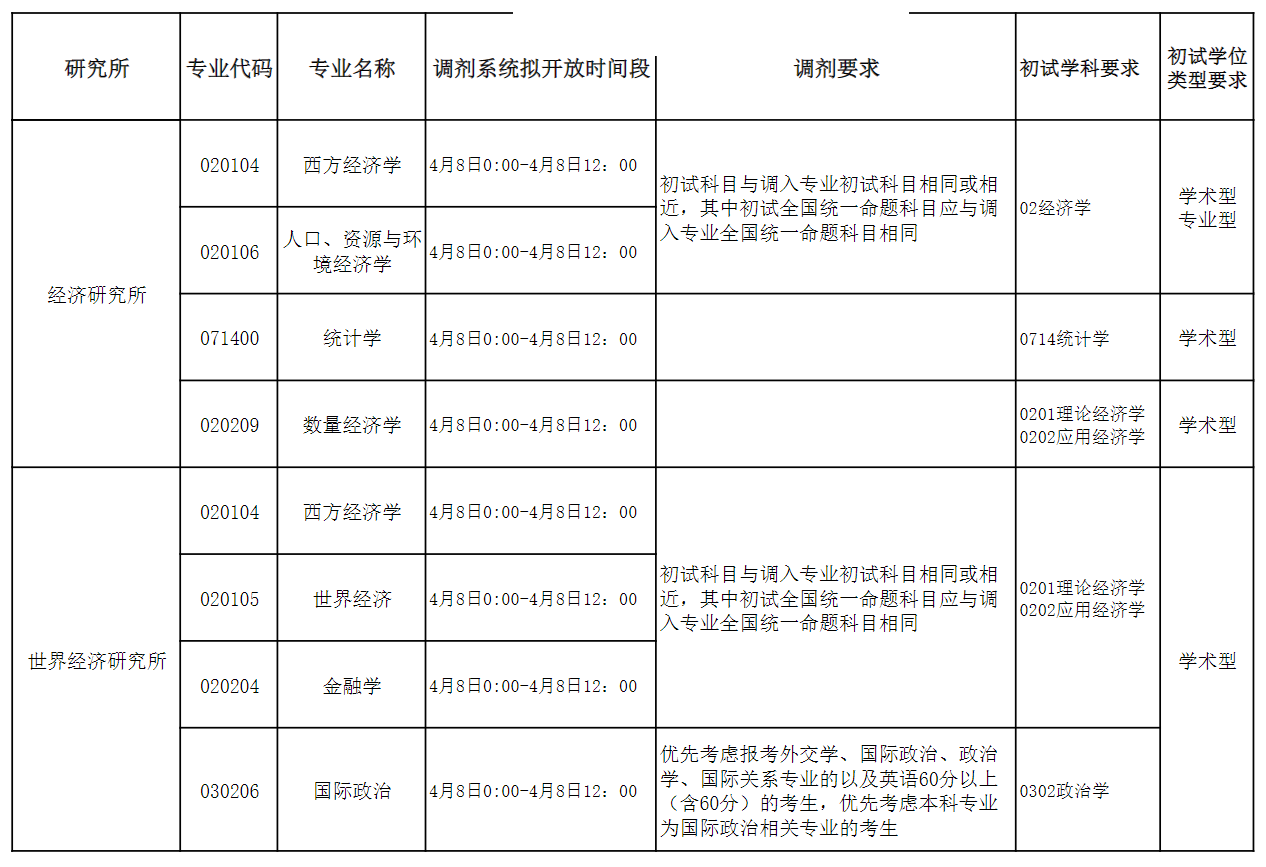 应用经济研究所020204金融学专业,020209数量经济学专业,0202Z1城市与房地产经济学专业 第二轮开放时间:4月15日0:00-4月16日0:00,调剂相关要求不变