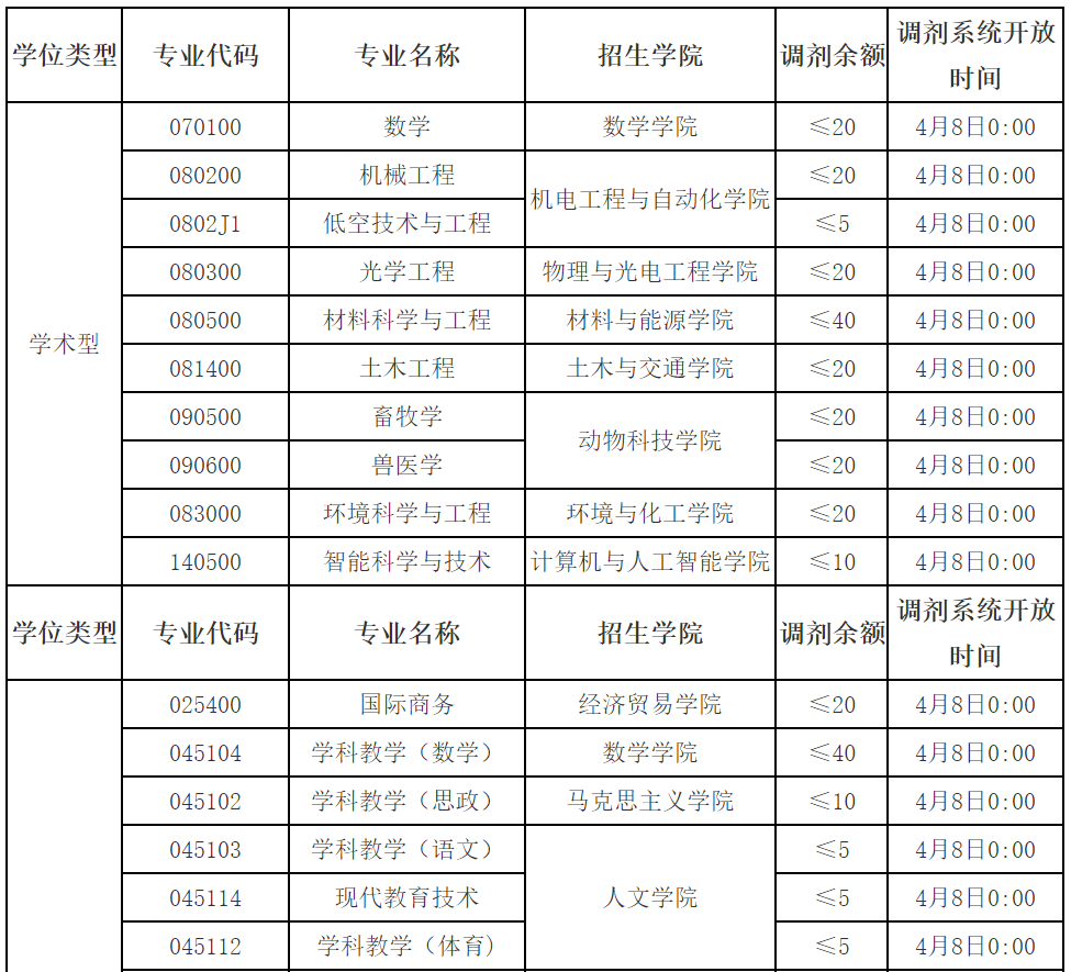 “全国硕士生招生调剂服务系统”将于2026年4月8日0:00正式开通。各专业调剂系统开放时间详见下表,各专业将根据报名情况在开放12小时后随时关闭系统,请考生及时填报。